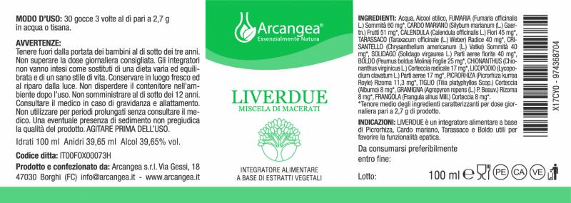 LIVERDUE 100 ML ESTRATTO IDROALCOLICO Una formulazione "classica" di piante officinali perattivare la depurazione del fegato e della cistifellea ed inviare le tossine da eliminare a rene ed intestino. L'efficacia del prodotto è documentata da anni di utilizzo tradizionale di Cardo Mariano, Boldo e Tarassaco, alcune fra le piante più importanti della miscela composta da ben 14 diverse erbe.